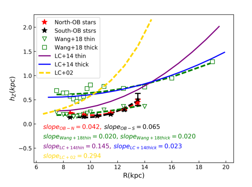 除了边缘增厚的起源进展外,该团队还测量到OB恒星盘的标高是0.14-0.5kpc,标长是1.17kpc,发现恒星盘的标高大小和气体盘的标高大小类似或无显著差异,以及南北盘边缘增厚是对称分布的等一系列盘的性质。这些观测结果意味着我们可以用年轻恒星来追踪更多的气体盘结构的动力学问题乃至尘埃盘的形成问题。目前的结果已经直接证实气体盘比恒星盘更加延展,间接给出了恒星盘和热尘埃盘可能更类似,以及气体盘和冷尘埃盘可能更类似的观测证据。最后该团队还发现银河系盘的中平面位移(即银河系的银道平面Z0的大小)在不同位置大小不同,并发现该位移分布体现出了疑似翘曲的信号,但是该翘曲信号的置信度和物理起源目前尚待进一步研究。