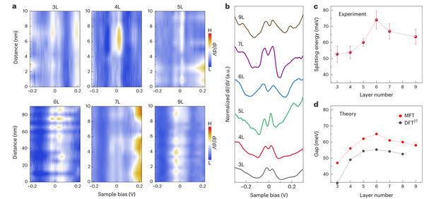 合作研究团队成功制备了三至九层的高质量菱形堆垛石墨烯,并通过扫描隧道显微镜和扫描隧道谱,研究了这些系统中层依赖的电子结构和电子关联现象。研究发现,多层菱形堆垛石墨烯中存在超平的电子能带,平带的宽度和层数密切相关,层间耦合随层数增加逐渐增强,厚层的菱形堆垛石墨烯平带变窄,这必然会增强电子-电子相互作用。通过测量不同电子填充因子的扫描隧道谱,研究团队观察到平带会发生较大的能量分裂并在六层时达到最大值,这充分说明了强电子-电子相互作用关联态的存在。本项研究表明,多层菱形堆垛石墨烯具有强的电子关联特性,其电子性质可以通过层数调控,是研究强关联系统物性的优异新型材料。