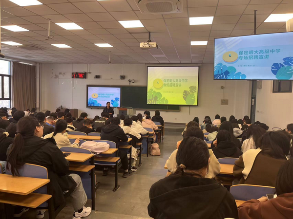 保定明大高级中学执行校长刘霞介绍了该校发展历程、办学理念、师资需求及人才培养体系等,重点解读了教师岗位的招聘要求及职业发展路径。她强调,明大高级中学高度重视青年教师的成长,提供完善的培训机制和晋升通道,欢迎优秀师范生加入。随后,该校人力资源负责人胡琳就薪资待遇、工作环境、招聘流程等问题与同学们进行详细交流和解答。